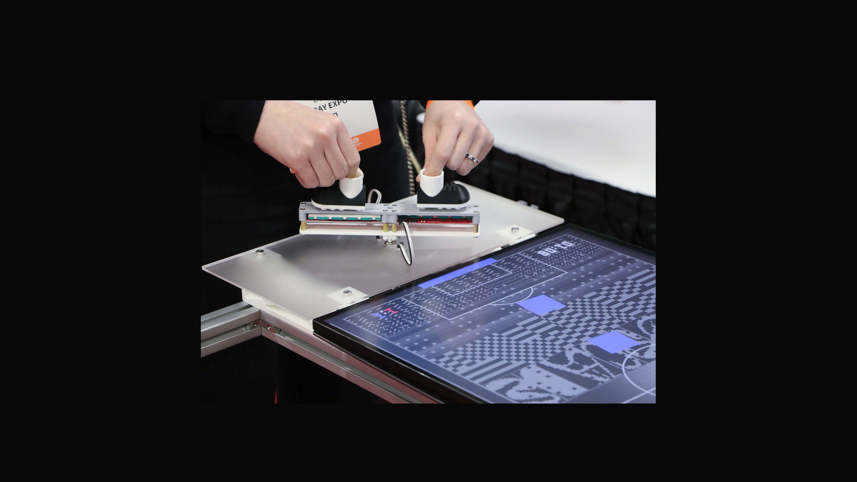 At the heart of FOOSCADE are its custom-made controllers, inviting players to place their fingers into the tiny boots and control virtual football cleats with precision. Maneuver the ball with finesse, using a combination of rotation and sliding motions to outplay your opponent. With the clock ticking, the goal remains simple yet exhilarating: score more goals in two and a half minutes than your rival.